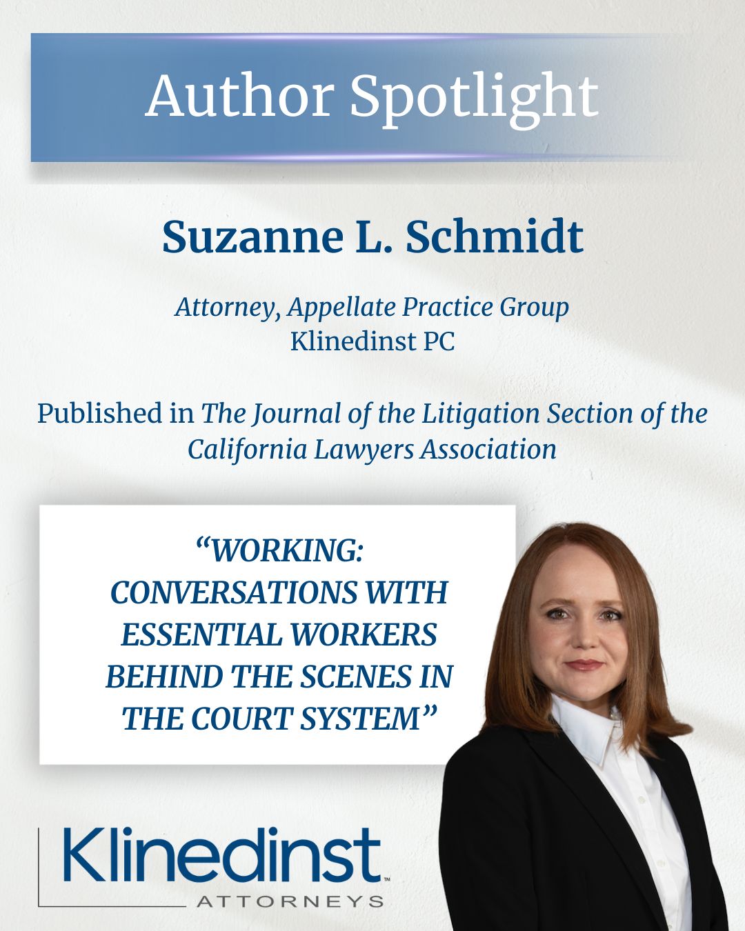 Klinedinst PC is honored to highlight counsel Suzanne L. Schmidt on her recent publication in The Journal of the Litigation Section of the California Lawyers Association. Her article, “Working: Conversations with Essential Workers Behind the Scenes in the Court System,” shines a light on the essential workers whose dedication keeps the judicial system moving.